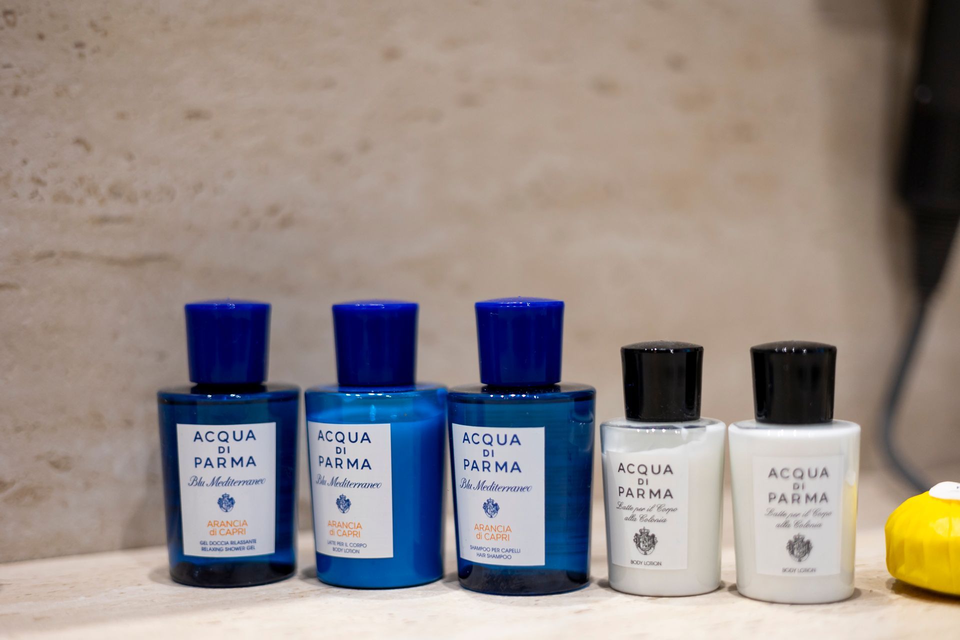 Prodotti Cortesia: Prodotti da bagno di marca (shampoo, balsamo, bagnoschiuma, lozione corpo, sapone mani) Acqua di Parma.