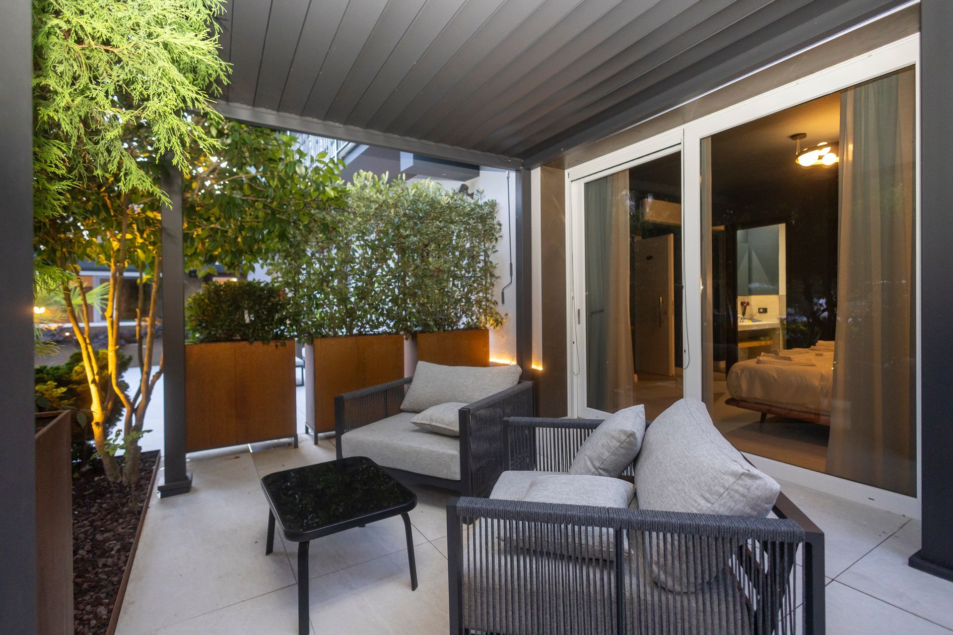 Gli spazi esterni di Petra Oasis Relais sono pensati per offrire un’esperienza di benessere totale, dove design e natura si incontrano. Tutti gli arredi outdoor sono firmati Roda, sinonimo di eleganza e resistenza, mentre tre raffinati gazebo in legno Ethimo creano angoli di ombra e intimità immersi nel verde. L’illuminazione esterna, a marchio Flos, esalta i percorsi e le architetture naturali al calar della sera.